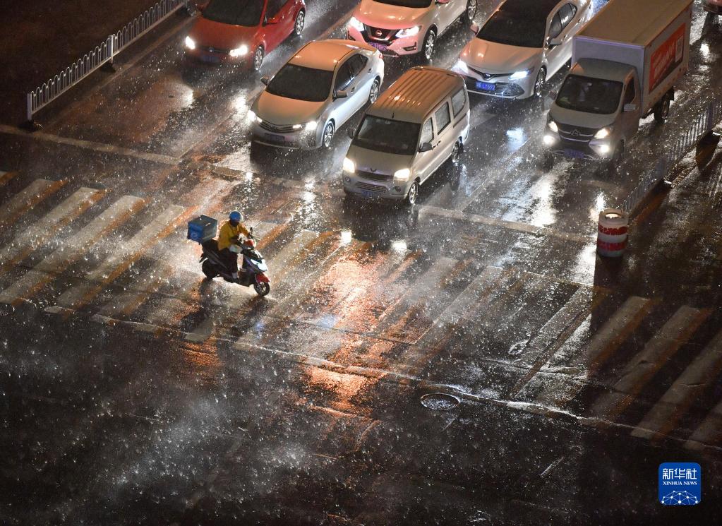 2021年4月15日傍晚,在天津市南開(kāi)區,外賣(mài)騎手在風(fēng)雨中騎行過(guò)馬路。