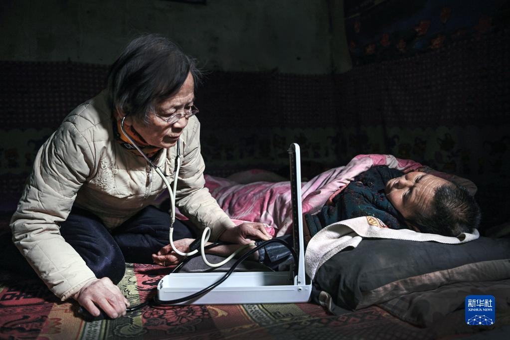 2021年1月18日,在陜西省榆林市佳縣店鎮賀家溝村農家窯洞里,路生梅跪坐在土炕上為癱瘓的村民喬愛(ài)芬義診。1968年,24歲的北京姑娘路生梅從北京第二醫學(xué)院(現首都醫科大學(xué))畢業(yè),只身來(lái)到千里之外的佳縣從醫。1999年,路生梅退休后,堅持留在佳縣為群眾義診。