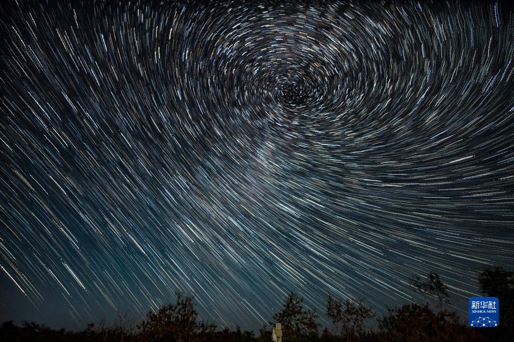 2021年9月1日在黑龍江五大連池世界地質(zhì)公園溫泊拍攝的星空(合成照片)。