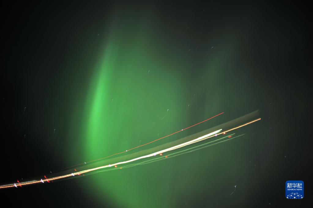 2021年3月20日凌晨,在美國阿拉斯加州安克雷奇,飛機飛過(guò)出現極光的天空(長(cháng)時(shí)間曝光照片)。