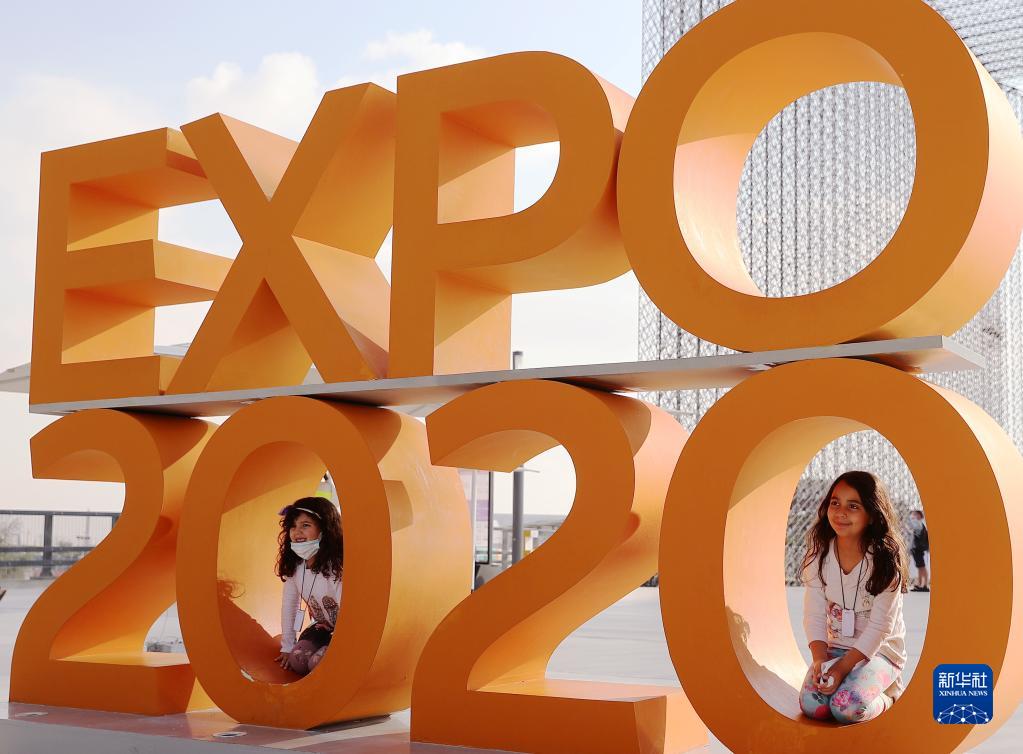 1月9日,兩名兒童在阿拉伯聯(lián)合酋長(cháng)國迪拜世博園門(mén)口拍照。