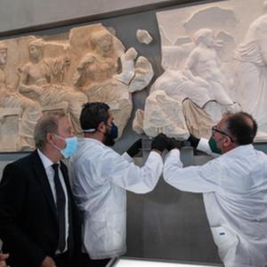 1月10日,在希臘雅典衛城博物館,工作人員正在將一塊原保存于意大利一家博物館的雅典衛城帕特農神廟石雕碎片放回原位。