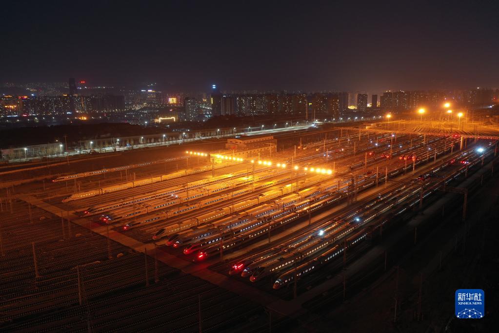 1月16日晚,動(dòng)車(chē)組列車(chē)??吭谥袊F路蘭州局集團有限公司蘭州車(chē)輛段蘭州西動(dòng)車(chē)運用所整備場(chǎng)上,為即將開(kāi)始的2022年春運做好準備(無(wú)人機照片)。