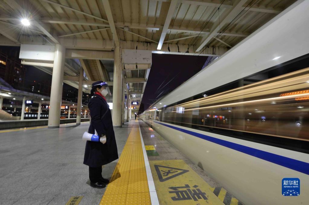1月28日晚,寇莉在接送過(guò)站列車(chē)。