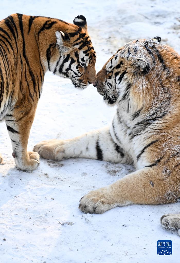 1月13日,在吉林省東北虎園內,兩只東北虎在雪地上嬉戲。