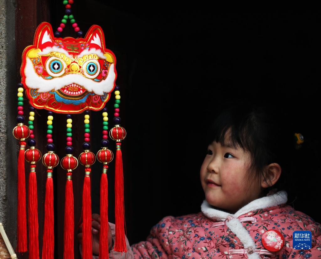 1月20日,在山東省臨沂市郯城縣紅花鎮馬圩子村,一名小女孩在虎頭中國結前駐足。