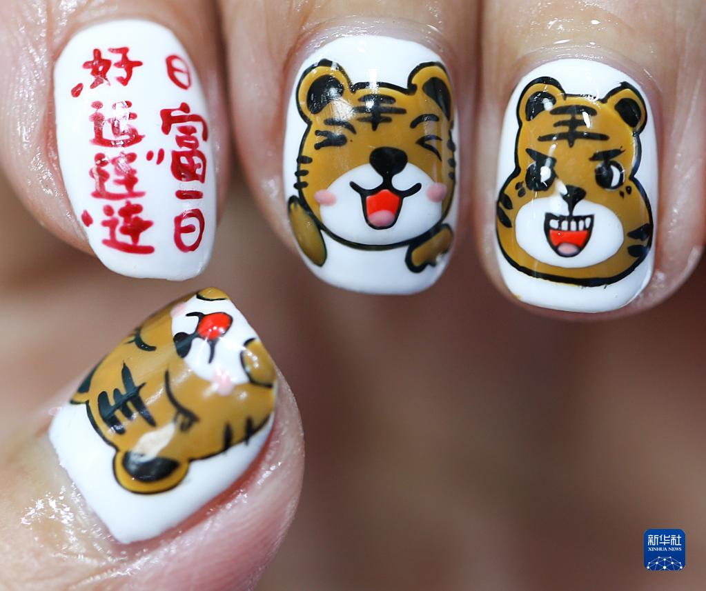 1月24日,江蘇連云港市連云區一家美甲工作室,一名女士展示手指上虎主題的美甲。