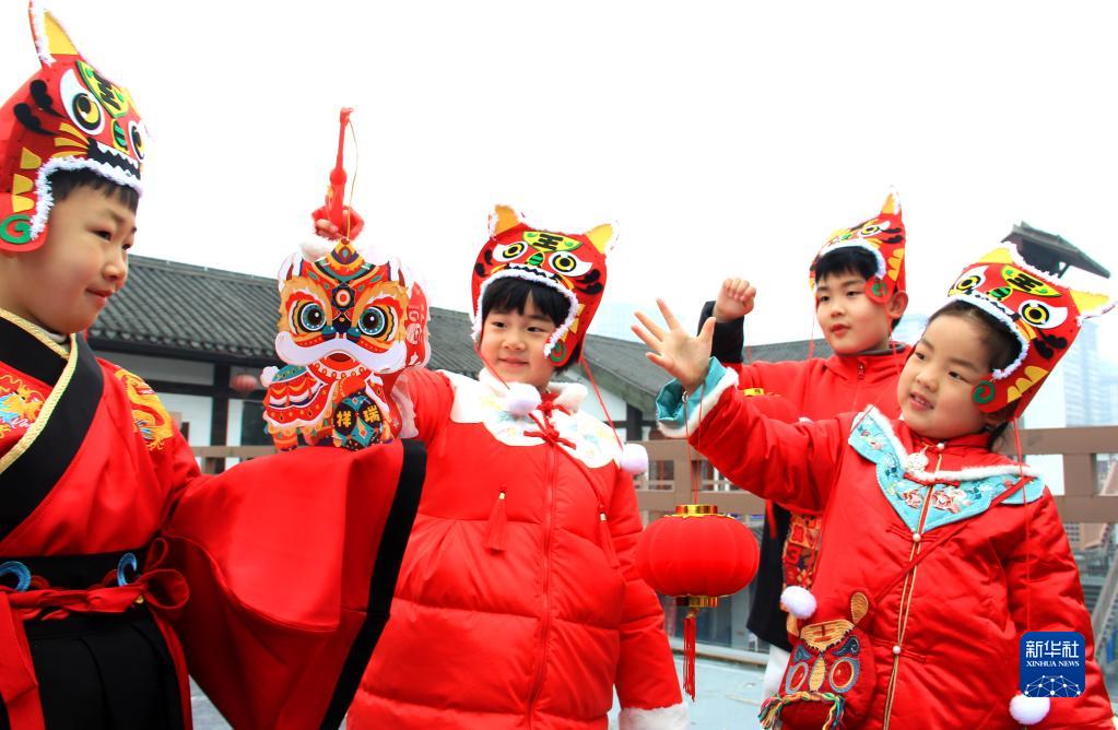 1月24日,在安徽省淮北市圖書(shū)館流動(dòng)圖書(shū)服務(wù)點(diǎn)隋唐運河古鎮相山書(shū)院,孩子們頭戴虎頭帽,手持紅燈籠,迎接春節到來(lái)。