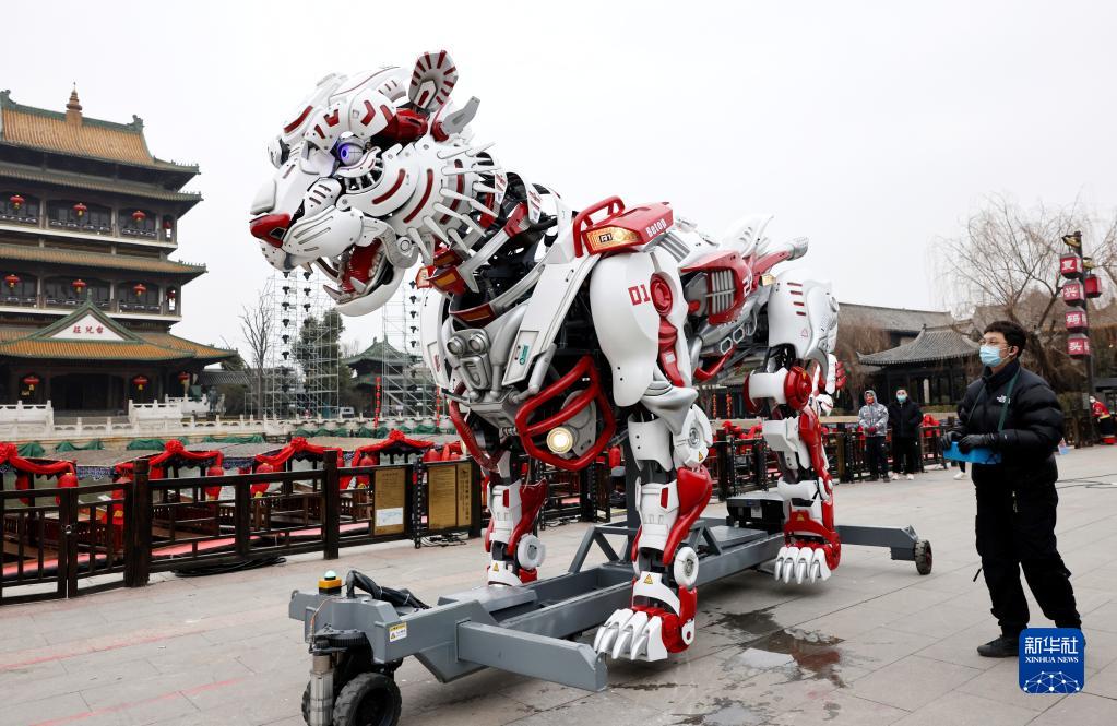 1月23日,在山東省棗莊市臺兒莊古城,技術(shù)人員在調試安裝“動(dòng)能虎”。該“動(dòng)能虎”高約3.6米、體重約1.8噸,集激光、3D全息等于一體,能模仿虎的行走、捕食、吼叫等。