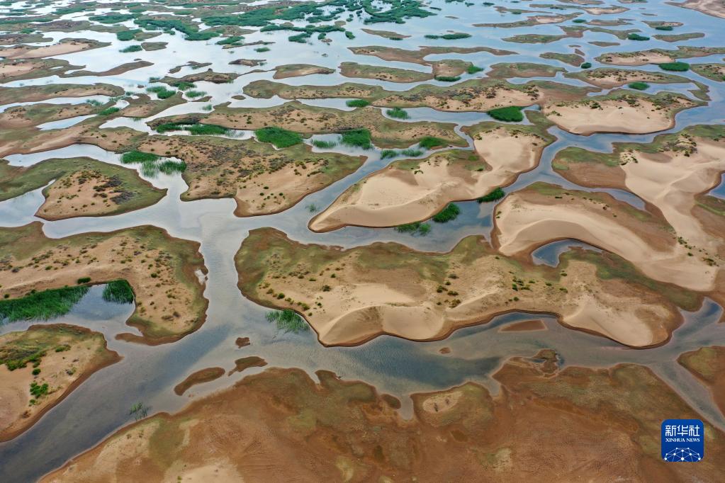 這是在內蒙古自治區鄂爾多斯市杭錦旗巴音溫都爾嘎查拍攝的庫布其沙漠濕地(2021年7月16日攝,無(wú)人機照片)。