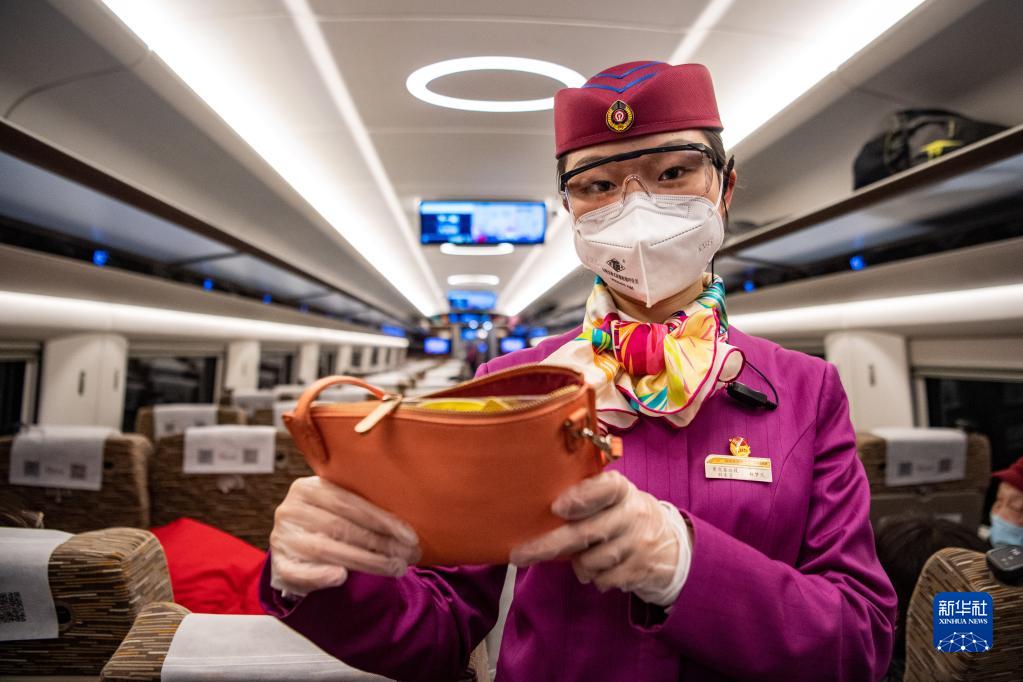 林夢(mèng)凡在成渝高鐵智能復興號“共青團號”列車(chē)上展示自己的““哆啦A夢(mèng)口袋”(1月27日攝)。