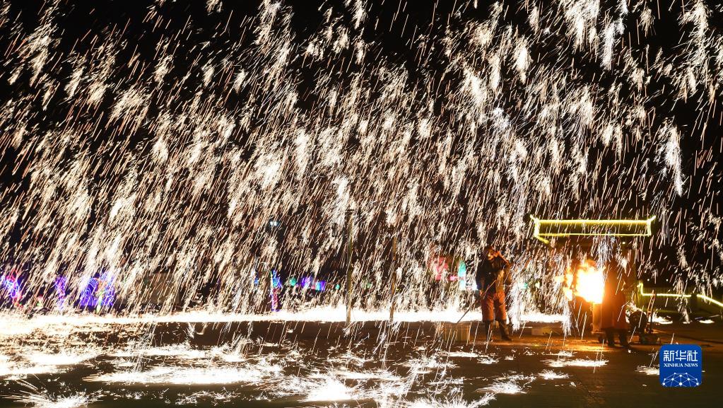 民俗藝人在銀川市黃河橫城旅游度假區為游客表演“打鐵花”(2月5日攝)。