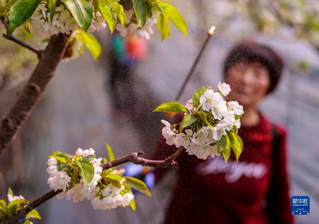 2月11日,在山東省榮成市上莊鎮尹家村光伏大棚內,種植戶(hù)為櫻桃花進(jìn)行人工授粉。