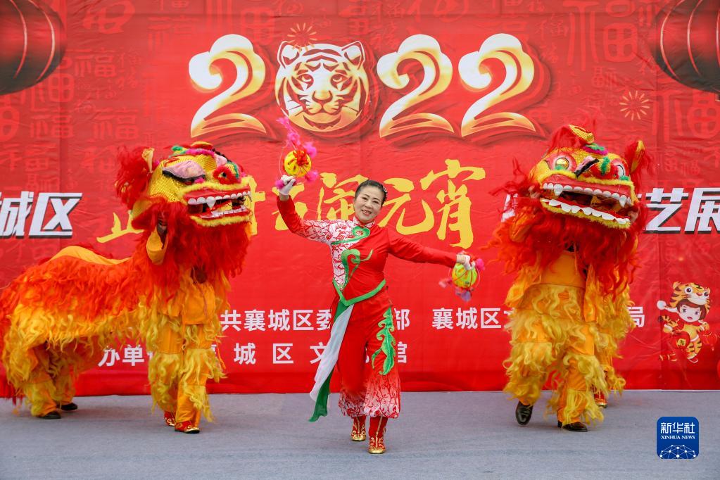 2月15日,在湖北省襄陽(yáng)市襄城區峴山文化廣場(chǎng),民間藝人進(jìn)行舞獅表演。