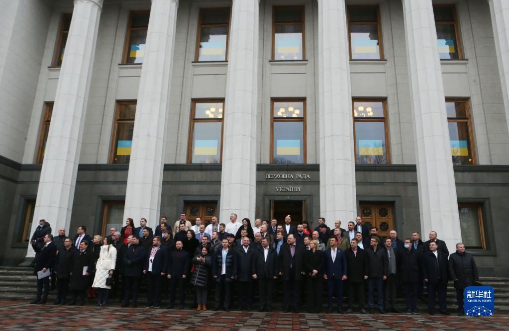 2月16日,在烏克蘭首都基輔,議員們在最高拉達(議會(huì ))門(mén)前的憲法廣場(chǎng)參加團結日慶?;顒?dòng)。