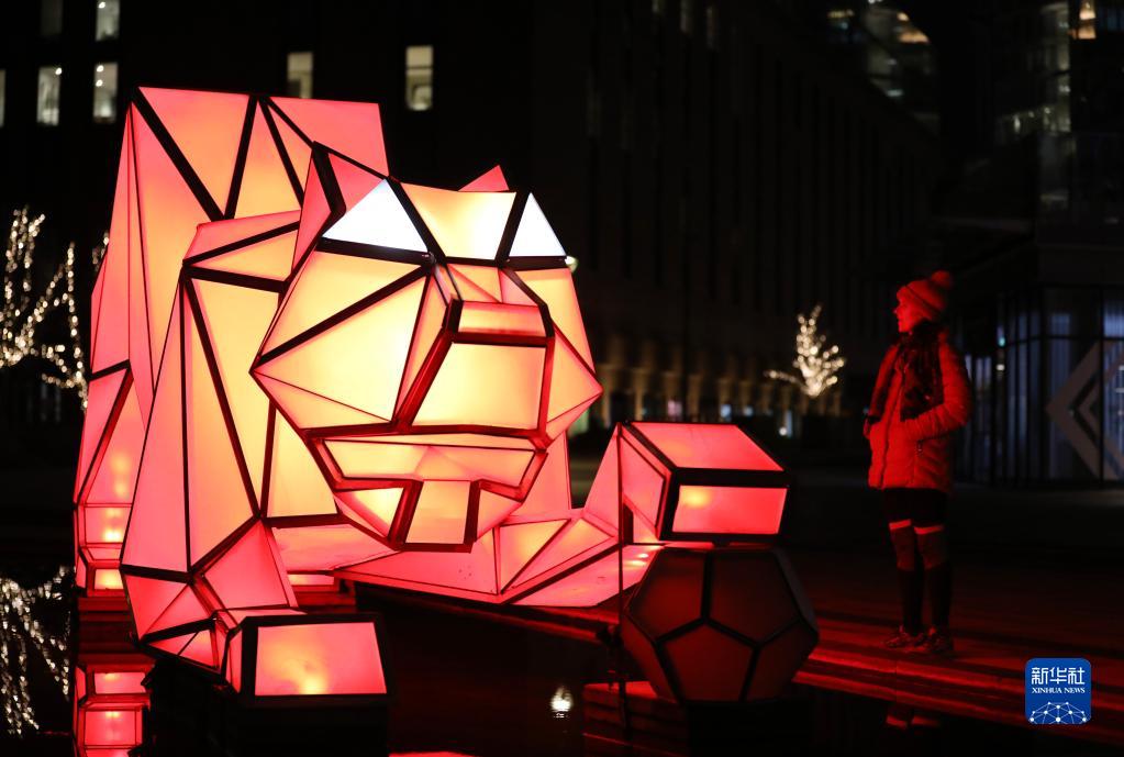 2月17日,在英國倫敦,慶祝中國虎年的燈光藝術(shù)裝置在巴特西發(fā)電站燈光節上展出。