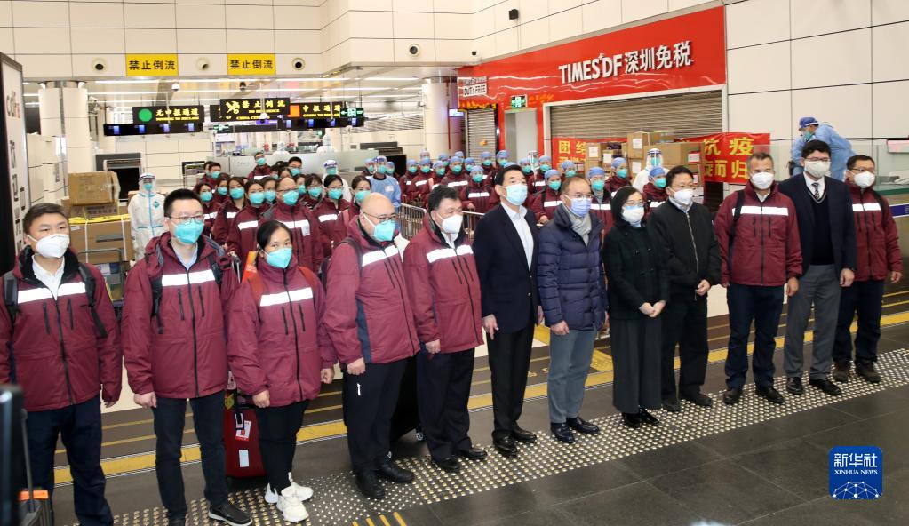 2月19日,在深圳灣口岸,援港抗疫醫療防疫工作隊成員與香港方面的迎接人員一起合影留念。