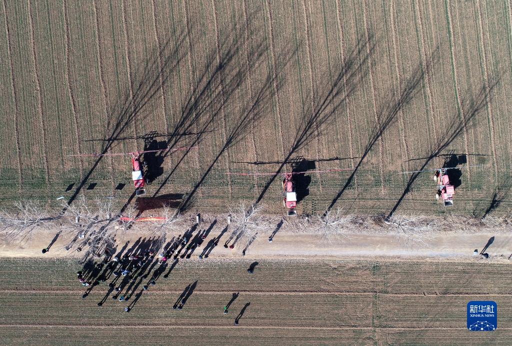 2月21日,在河北省石家莊市鹿泉區山尹村鎮麥田,農業(yè)專(zhuān)家給當地農民開(kāi)展田間授課(無(wú)人機照片)。