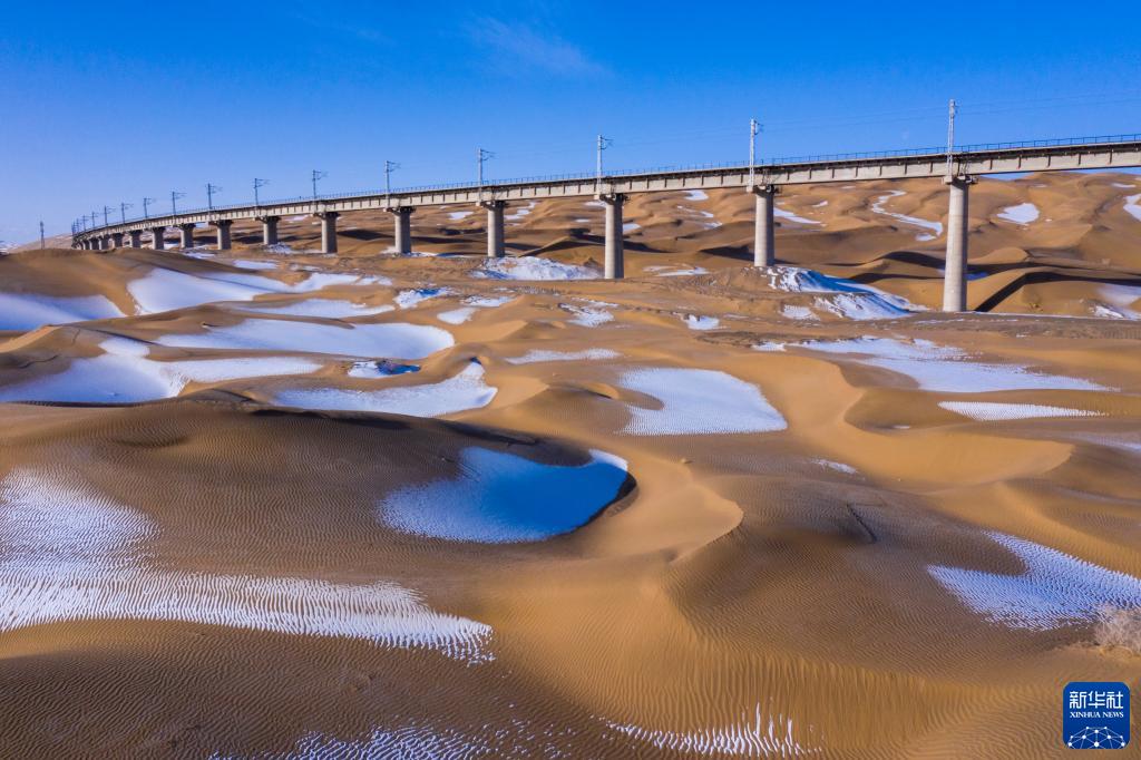 2月21日拍攝的甘肅省酒泉市阿克塞哈薩克族自治縣境內的庫木塔格沙漠雪景(無(wú)人機照片)。