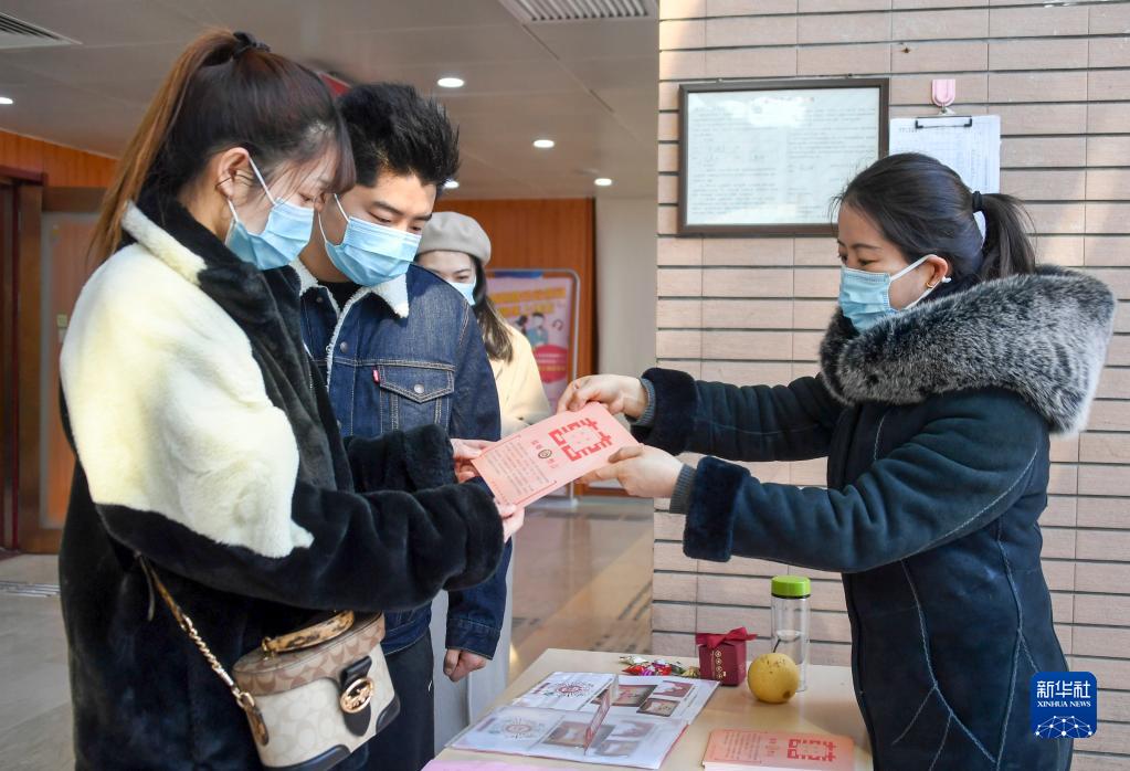 2月22日,北京市海淀區民政局婚姻登記處的工作人員(右)向新人贈送結婚誓言紀念卡。
