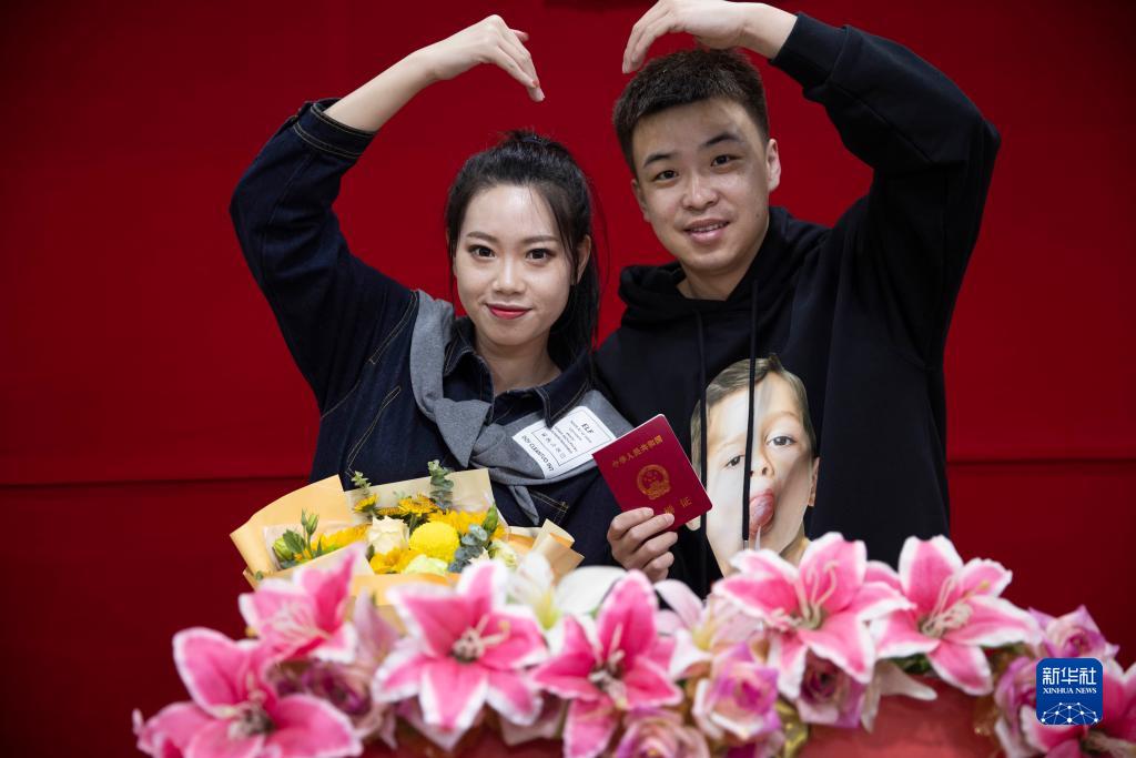 2月22日,在哈爾濱市道里區民政局婚姻登記處,新人完成結婚登記后拍照。