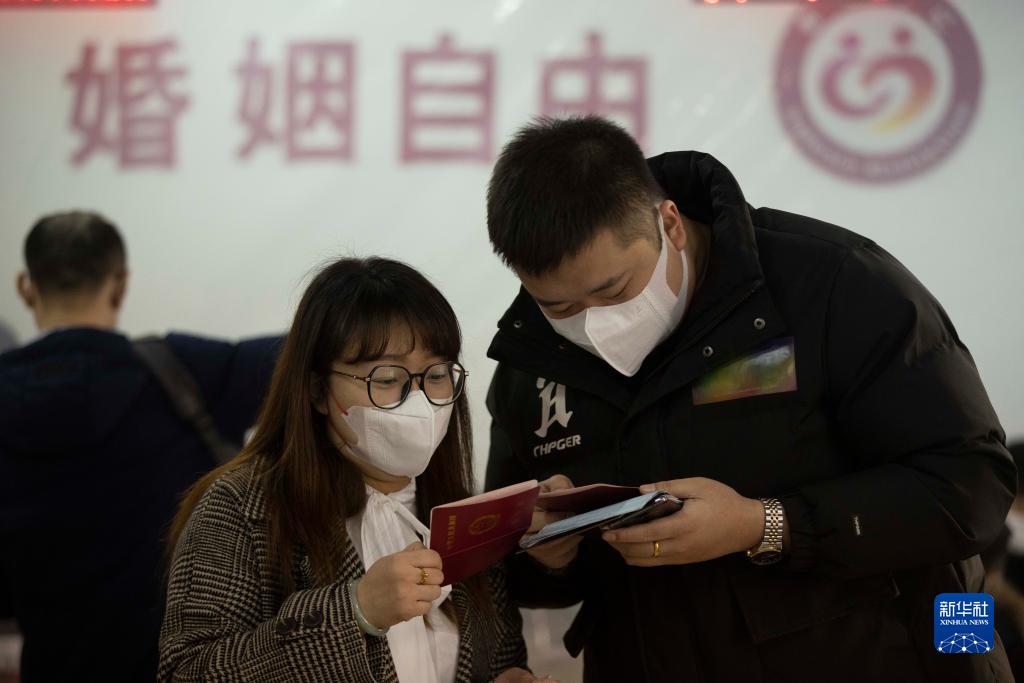 2月22日,在哈爾濱市道里區民政局婚姻登記處,新人拿到結婚證。