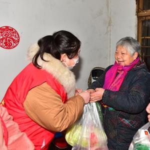 2月23日,在江西省南昌市東湖區董家窯街道青陽(yáng)社區,志愿者為吳金蓮老人(中)送代購的藥品和蔬菜。