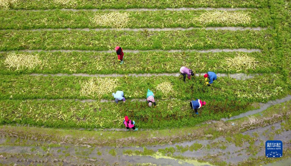 2月23日,廣西賀州市八步區蓮塘鎮白花村農民在采摘收獲蔬菜(無(wú)人機照片)。