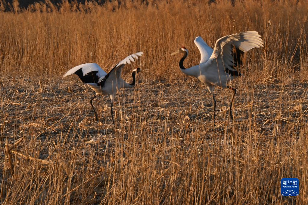 2月23日,兩只國家一級保護動(dòng)物丹頂鶴在山西省大同市廣靈縣壺流河濕地駐足棲息。新華社記者 馬毅敏 攝