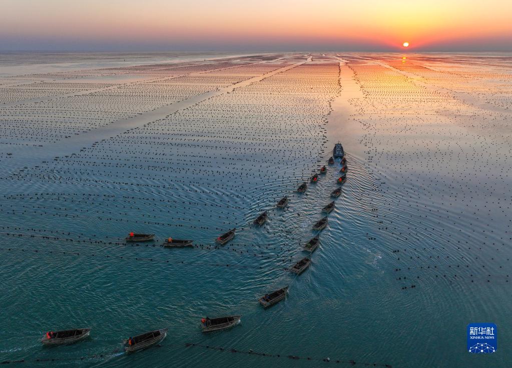2月24日,在山東省榮成市俚島鎮俚島灣海域,漁民們駕駛著(zhù)漁船、舢舨迎著(zhù)朝陽(yáng)出海作業(yè)(無(wú)人機照片)。