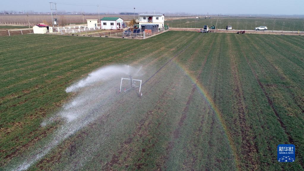 2月24日,在山東省郯城縣李莊鎮,一家庭農場(chǎng)使用智能水肥一體化灌溉設備施肥澆水(無(wú)人機照片)。