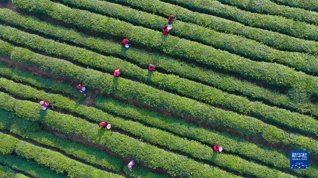 2月24日, 在浙江省湖州市德清縣武康街道對河口村一處茶園,人們搶抓農時(shí)為茶樹(shù)施肥(無(wú)人機照片)。