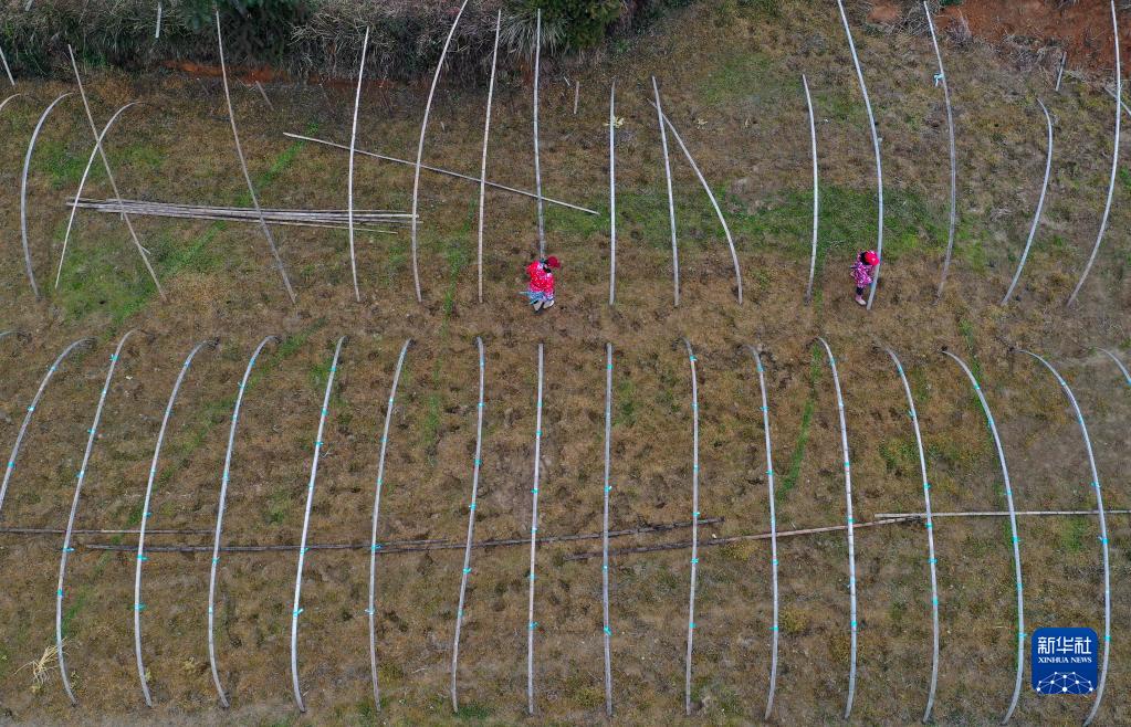 2月28日,村民在貴州省黔東南苗族侗族自治州丹寨縣興仁鎮燒茶村的田里搭建瓜棚(無(wú)人機照片)。
