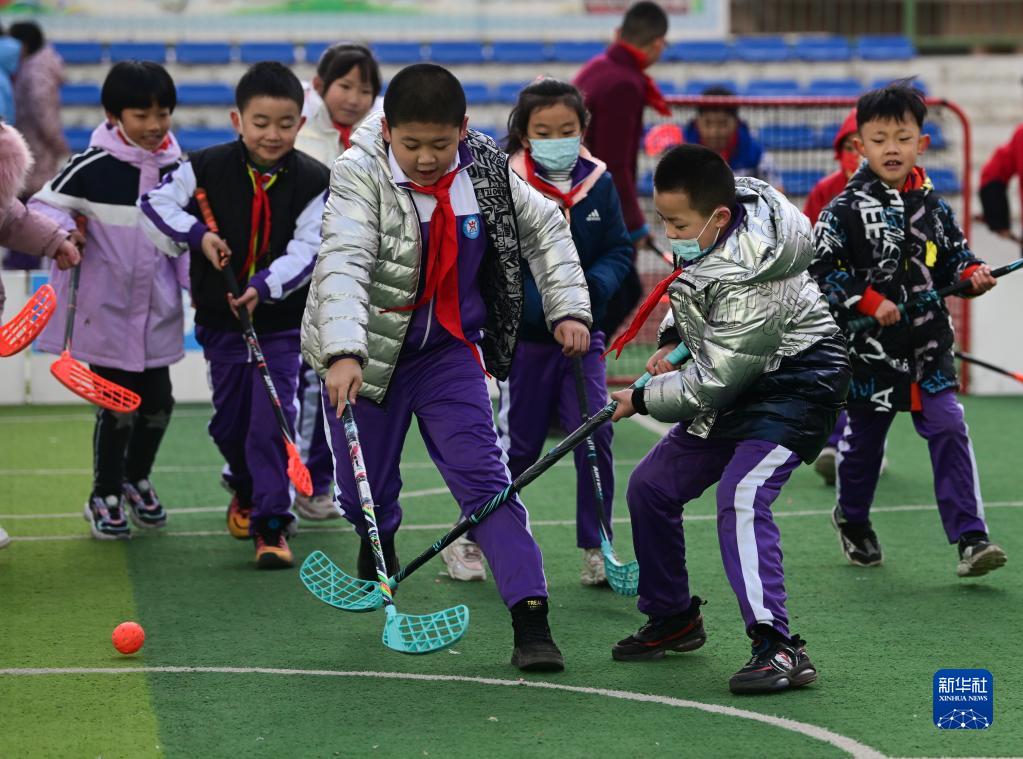 3月1日,西寧市城西區文匯小學(xué)學(xué)生在校園里體驗旱地冰球。