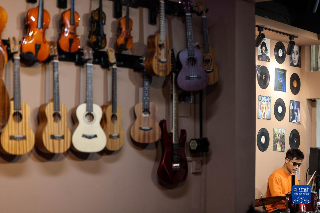 3月1日,“折耳根”樂(lè )隊鼓手陳昌海在琴行內排練。