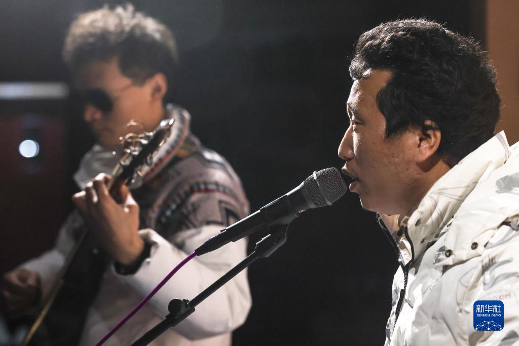 3月1日,“折耳根”樂(lè )隊主唱陳克興(右)在琴行內排練。