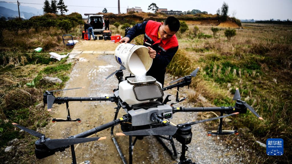 3月2日,廣西融安縣長(cháng)安鎮大巷村農民在給植保機裝肥。
