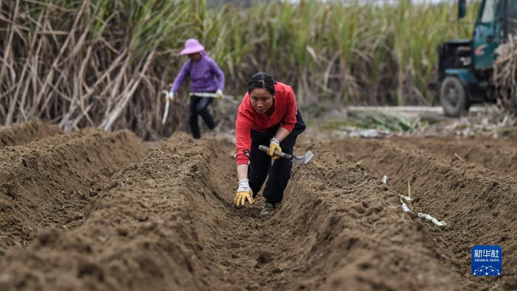 3月2日,在廣西融安縣潭頭鄉新林村,村民在種植甘蔗苗。