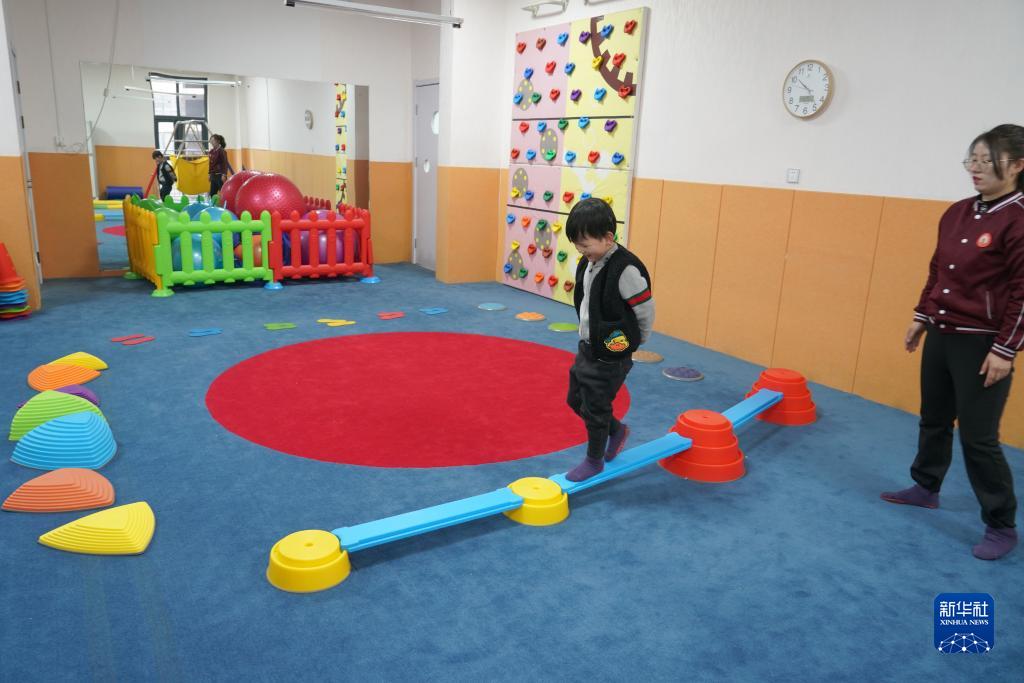 3月2日,在西安市蓮湖區愛(ài)爾堡幼兒園體能活動(dòng)室內,一名聽(tīng)障兒童在老師的幫助下進(jìn)行感統失調訓練課程。