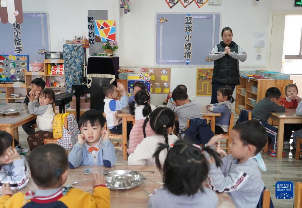 3月2日,在西安市蓮湖區第八幼兒園小二班教室內,2名聽(tīng)障兒童與小伙伴們一起進(jìn)行吃飯前的準備活動(dòng)。