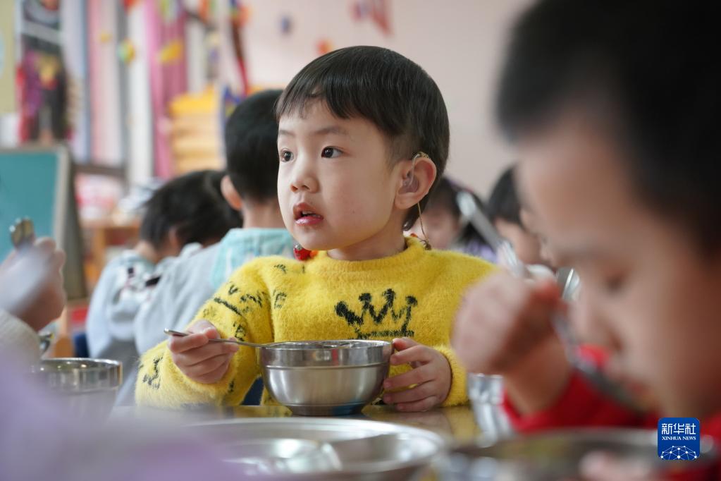3月2日,在西安市蓮湖區第八幼兒園小二班教室內,一名聽(tīng)障兒童與小伙伴一起吃午飯。