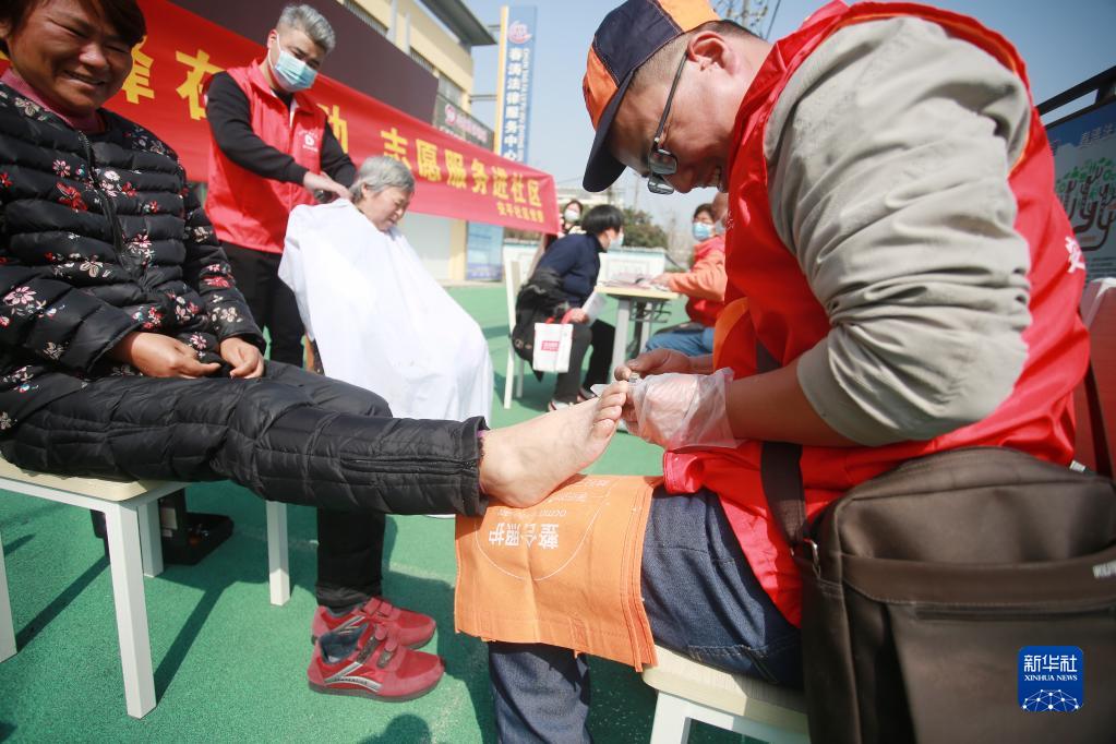 3月3日,在江蘇省揚州市邗江區竹西街道安平社區,志愿者為居民修腳。