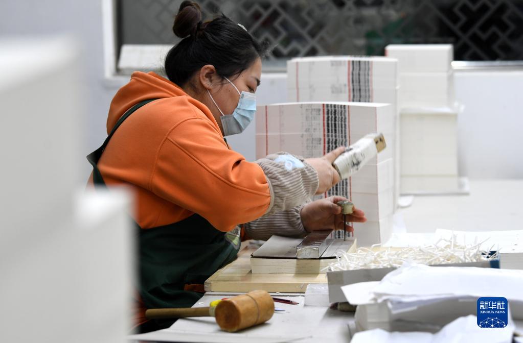 3月3日,工人在涇縣丁家橋鎮一家宣紙企業(yè)內制作宣紙線(xiàn)裝書(shū)。