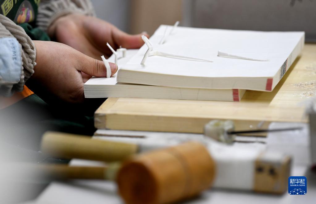 3月3日,工人在涇縣丁家橋鎮一家宣紙企業(yè)內制作宣紙線(xiàn)裝書(shū)。