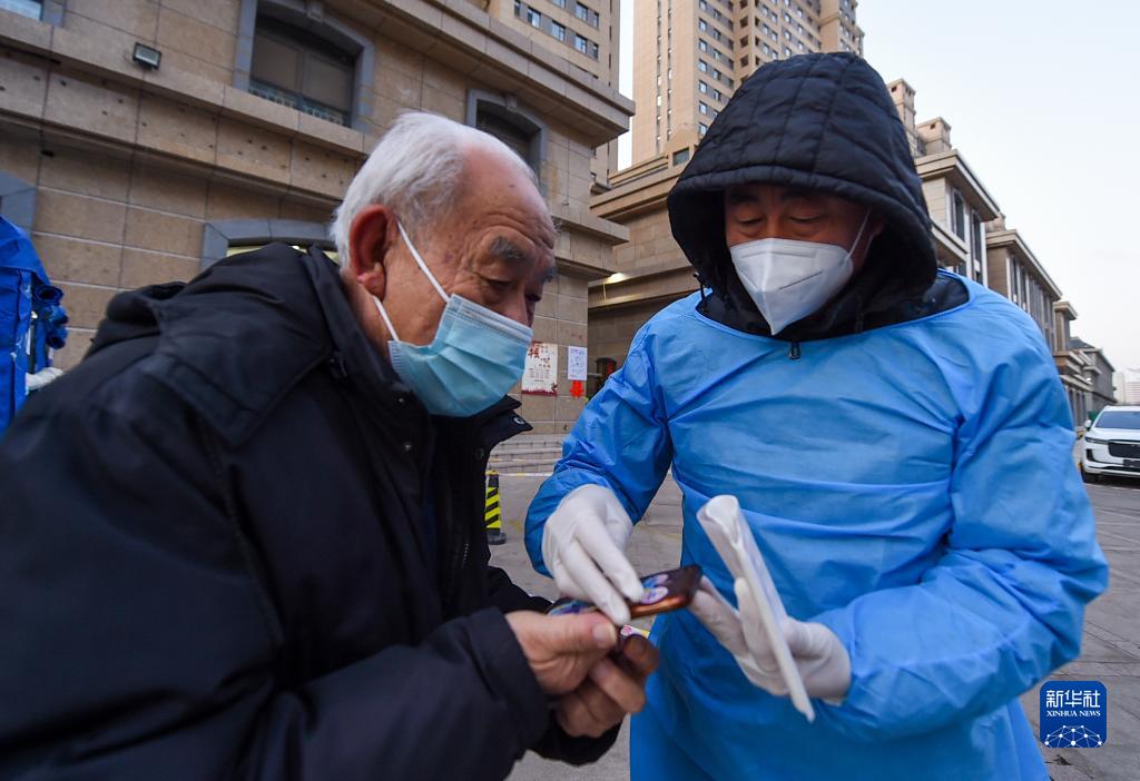 3月4日清晨,在呼和浩特市回民區攸攸板鎮賽馬場(chǎng)北路社區某核酸采樣點(diǎn),工作人員為群眾發(fā)放采樣標簽。
