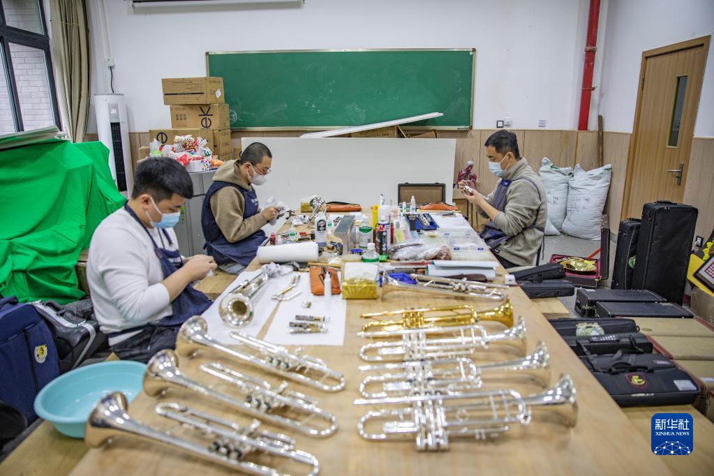 圖為在重慶市特殊教育中心的意見(jiàn)工作室內,學(xué)校組織器材養護人員對樂(lè )器進(jìn)行集中維修保養(1月12日攝)。
