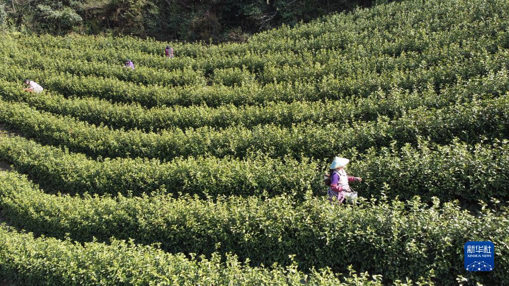 春暖茶山,春茶萌芽,茶農們采摘茶葉嫩芽,供應市場(chǎng)。