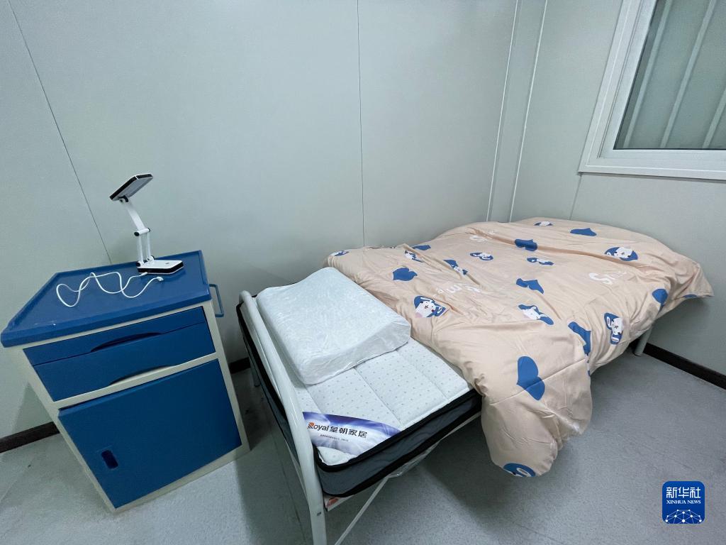這是3月9日拍攝的方艙醫院房間(手機照片)。每位入住者配有一床薄羽絨被及被罩、一個(gè)乳膠枕頭及枕套、一個(gè)床頭柜及充電式折疊小臺燈。