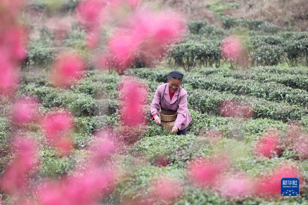 3月10日,一名婦女在廣西三江侗族自治縣和平鄉板六村采摘春茶。