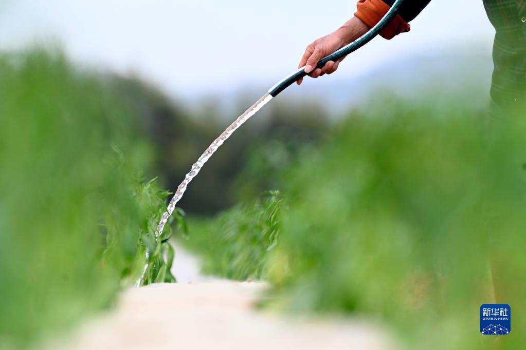 3月13日,在廣西柳州市柳東新區雒容鎮坭橋村,村民在地里給剛種植的辣椒苗澆水。